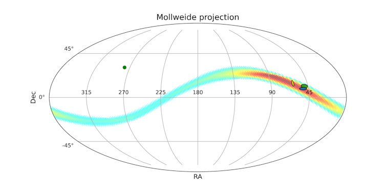 The first hint that there might be a connection between the CNEOS14 meteorite and Planet 9 came when we plotted on the sky the orbit that the planet would have chosen according to the most detailed simulations and overlaid the origin of CNEOS14. We have found a striking match (see the figure below) between the meteorite’s origin and the region where the simulations are most likely to find Planet 9. There is about a 1% chance that such a match is the result of chance.